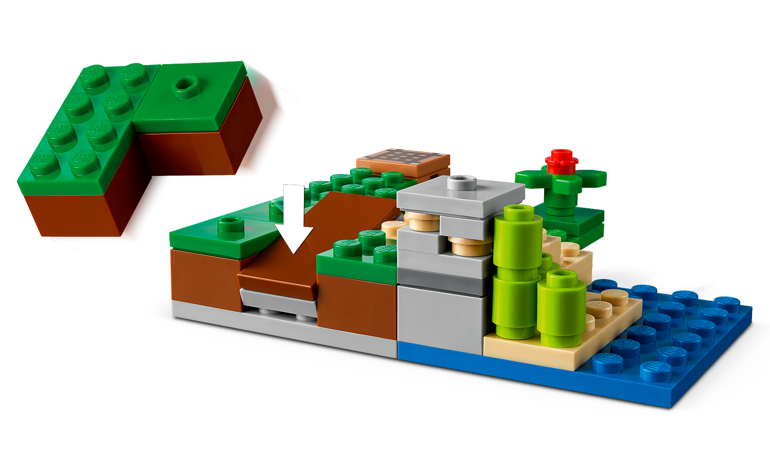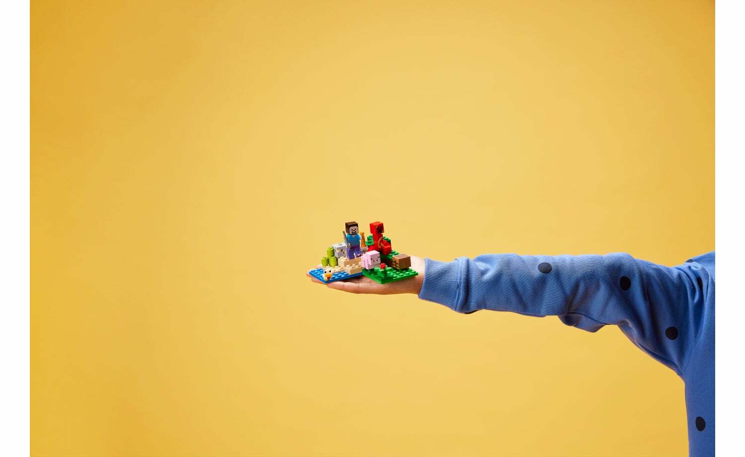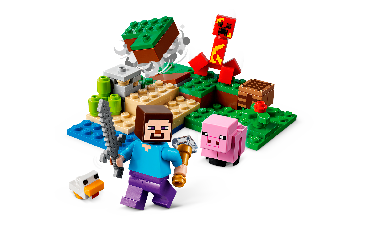 這套小巧而經典的 Minecraft 冒險盒組有豐富特色,可讓孩子玩得愛不釋手。遊戲的英雄角色之一-Steve,配上幼年豬、幼年雞與爆炸苦力怕。首先,孩子可在工作台用鐵礦發揮創意。再來他們可照顧動物、照料甘蔗,以及用罌粟裝飾場景。接著,他們能揮劍對抗可怕的爆炸苦力怕。孩子按下特殊引爆方塊即可將爆炸苦力怕炸到空中,結束戰鬥。遊戲結束後,這套樂趣無窮的盒組放在孩子房間當作擺設也十分美觀。