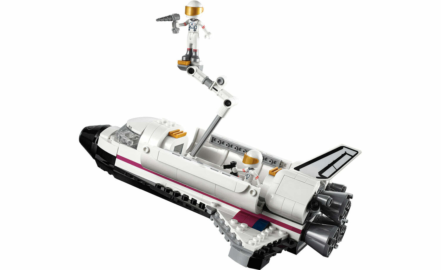 喜歡太空船玩具的孩子一定會熱愛這款樂高太空梭模型。酬載艙可透過裝有鉸鏈的門開啟,就像實物一樣,而樂高娃娃可裝到遙控機械手上,探索太空。地球上有望遠鏡、多軸訓練器、任務指揮中心,以及有太陽、地球與月球軌道模型的太空展覽館。