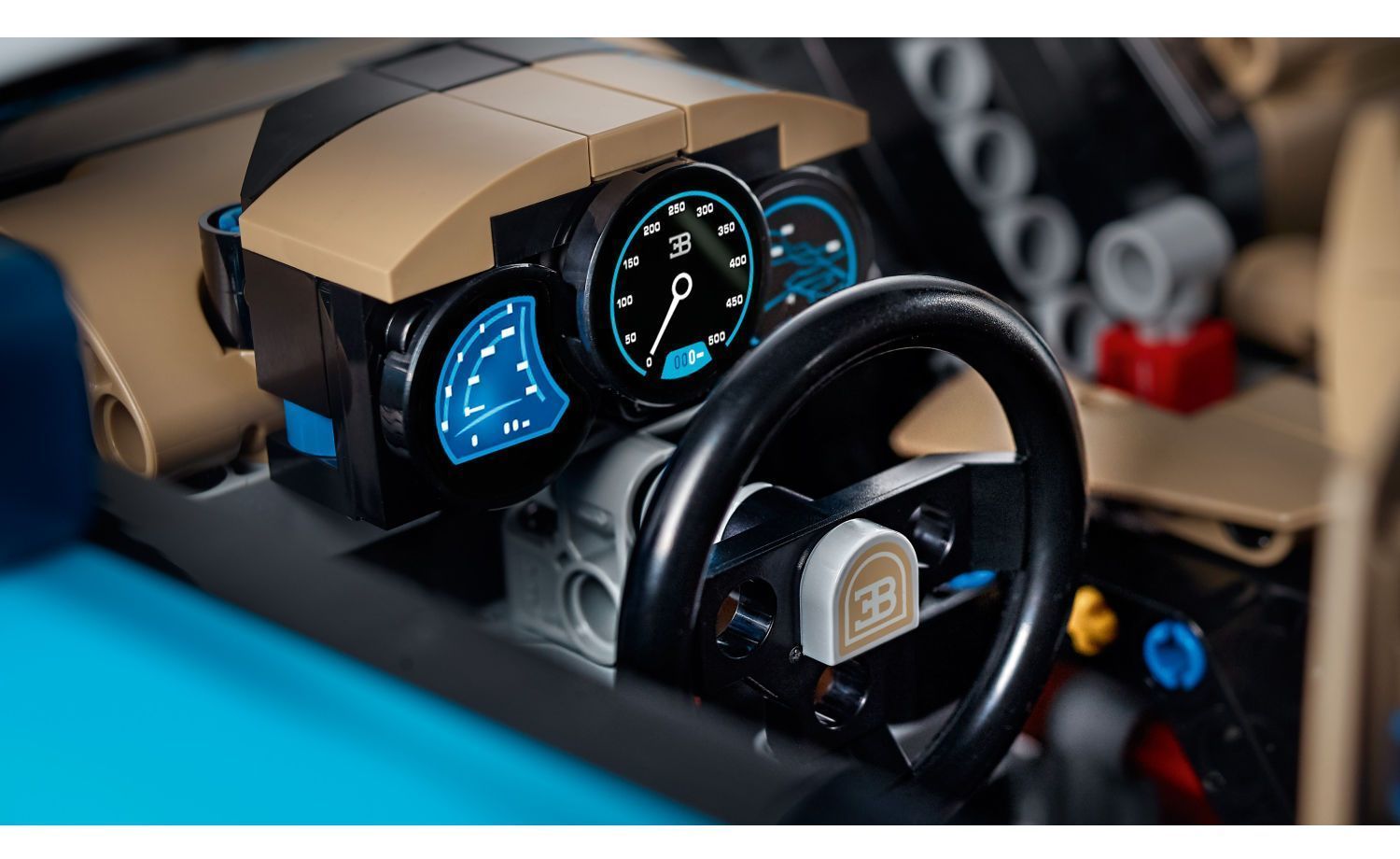• 打開車門,進入精緻的駕駛座,內有附可動換檔撥片的樂高® 科技系列八速變速箱,以及帶有 Bugatti 標誌的方向盤。