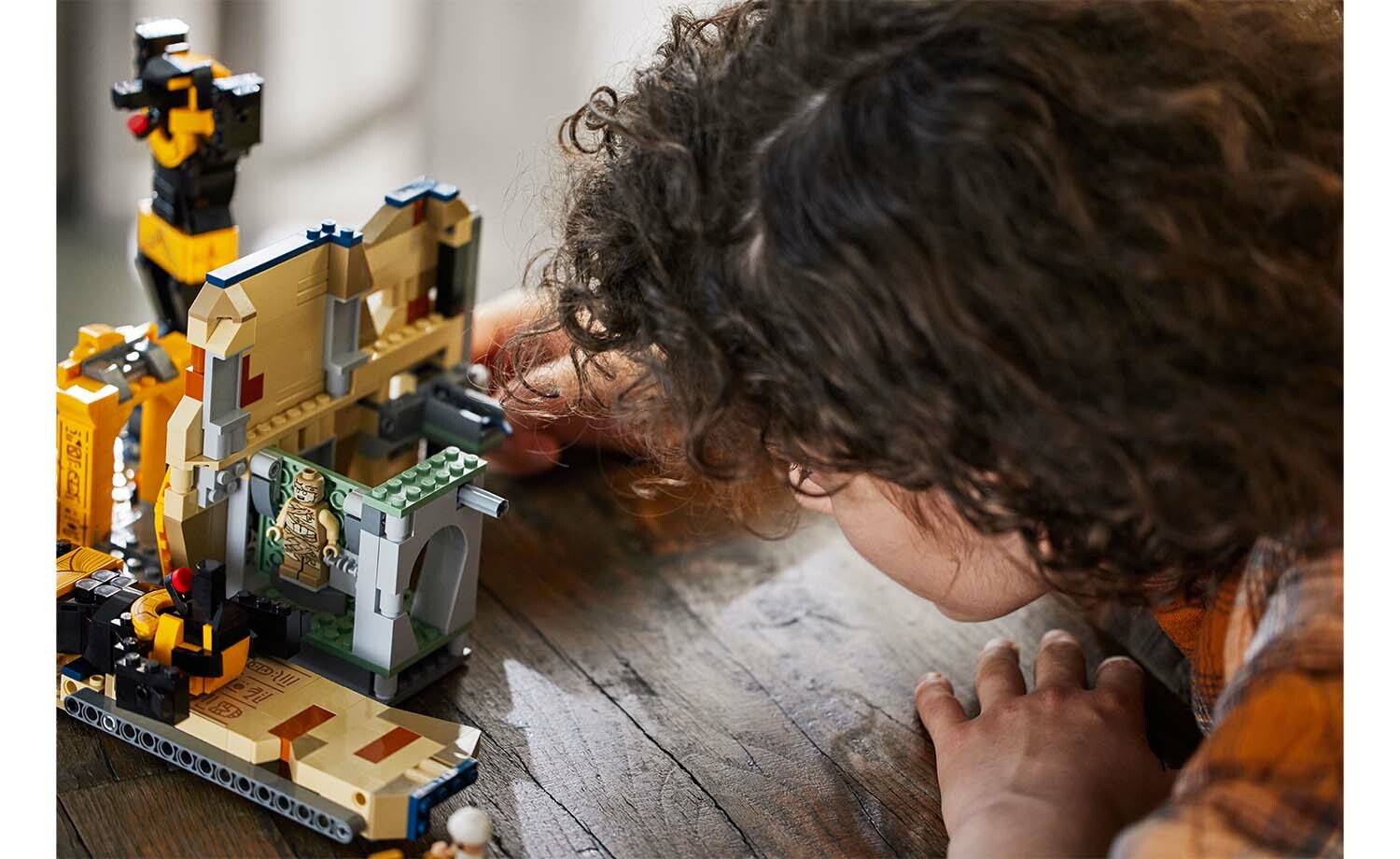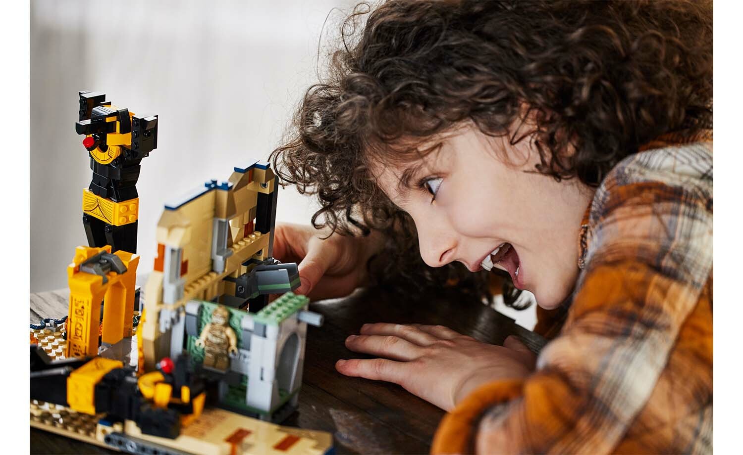 此拼砌盒組內有 4 隻人偶:配有著名帽子與長鞭的印第安納瓊斯、瑪莉安瑞文伍德™、薩勒™ 與木乃伊,此外還有法櫃、讓孩子上演經典電影《法櫃奇兵》的知名逃脫場景。