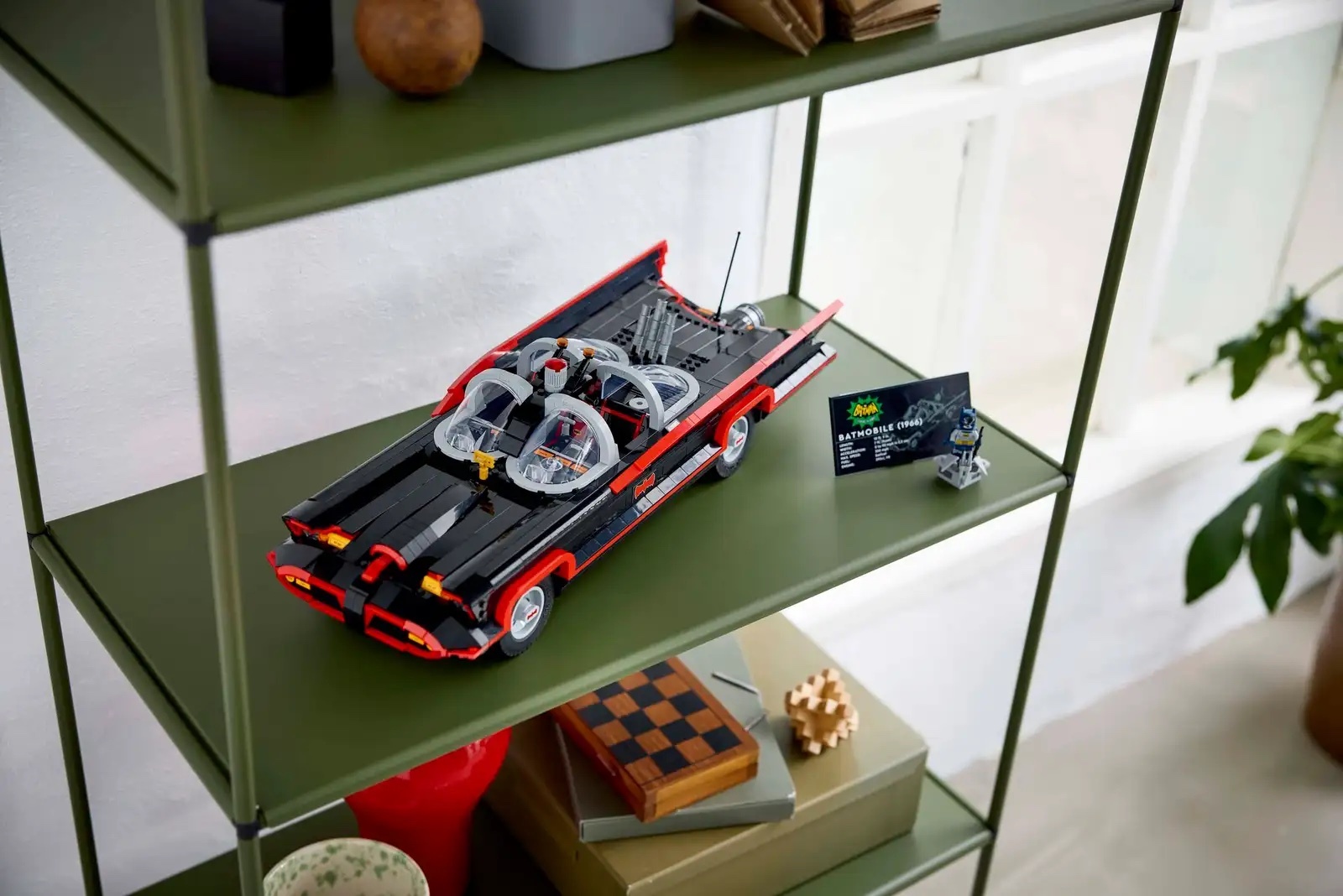 • 忠實還原的配件-這款可拼砌與展示的模型值得收藏,配有車輛資訊牌和 1966 年風格蝙蝠俠™ 人偶