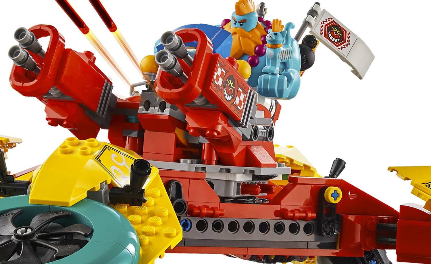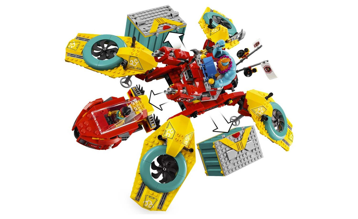 孩子可用悟空小俠戰隊飛行器在自己的壯闊故事中成為英雄、讓他們的朋友驚嘆。這款樂高® 悟空小俠™ 直升機玩具(80023)搭載 2 支彈簧射擊器與 2 個「貨櫃」,貨櫃中有許多家常特色,如雙層床和拼砌式遊戲機台。此盒組內附 8 隻人偶與 2 個玩偶,包括悟空小俠、龍小驕、沙大力、貓咪毛毛、蜘蛛精、附《西遊記》書籍零件的唐師父,還有附飛行器的紅孩兒,加上 1 隻作戰用的「蜘蛛毒」彈簧射擊器。